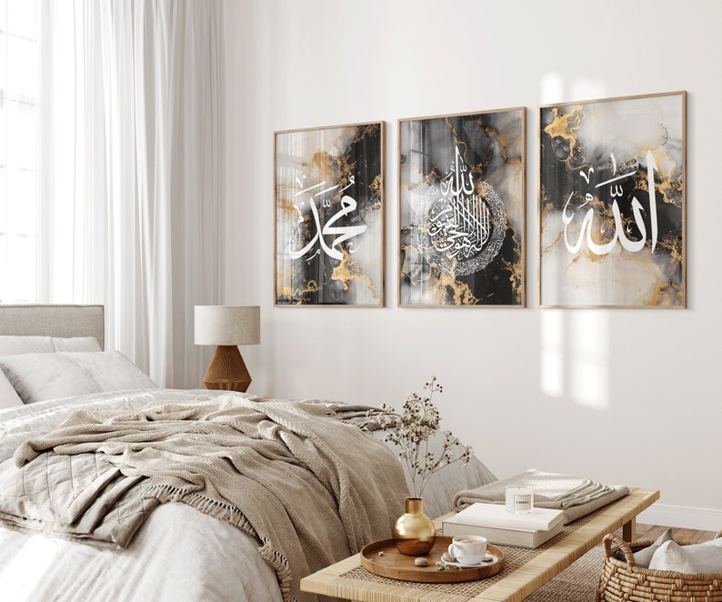 Style unique de décoration murale pour votre salon, cuisine, salle de bain, salle à manger, bureau, buanderie ou dortoir ! Ensemble de 3 tableaux muraux, affiches Boho et décor mural moderne. Idéal pour votre maison, ces décorations murales modernes en Noir, Doré,et Blanc ajoutent une touche élégante à tout espace.
